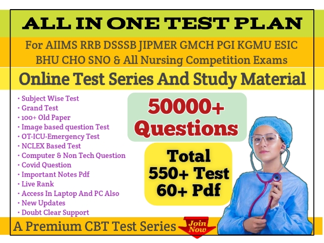 In This 'ALL IN ONE TEST SERIES' Exam Series consists total 500+ Test. अगर आप भी कर रहे है AIIMS NORCET or Other Nursing Officer Exam की तेयारी तो आपके लिए Nurses Hub लाया है पूरे 12 महीने तक का टेस्ट पैक आज से ही करे अपनी तेयारी जिसमे मिलेगा आपको 500+ Test 1. Previous Years Paper Test/Pdf 2. Image Based Question Test 3. Subject Wise Test 4. Major Test 5. NCLEX Based Question Test 6. OT ICU Emergency Question Test 7. Original Old Paper Test 8. Important Golden Point Pdf 9. New Updates and 24*7 Support. 10. Available Android or window App 11. Use In Laptop and Computer Also Thanks ALL THE BEST FOR NURSING OFFICER EXAM Nurses Hub Wishing you for your Bright Future Ahead.....